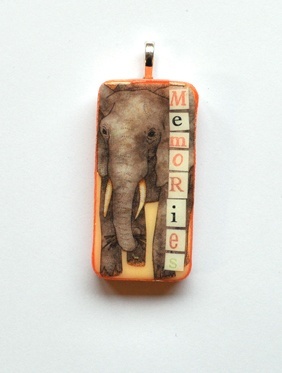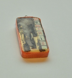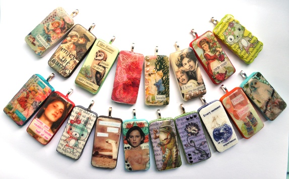 Dette anhenget består av en dominobrikke (2,5 x 5 cm)som er dekorert med forskjellige ting som feks papir utklipp, servietter og bånd for å skape en liten unik og dekorativ collage. Overflaten er beskyttet med dimensional lakk som gir dybde.
