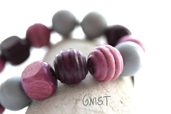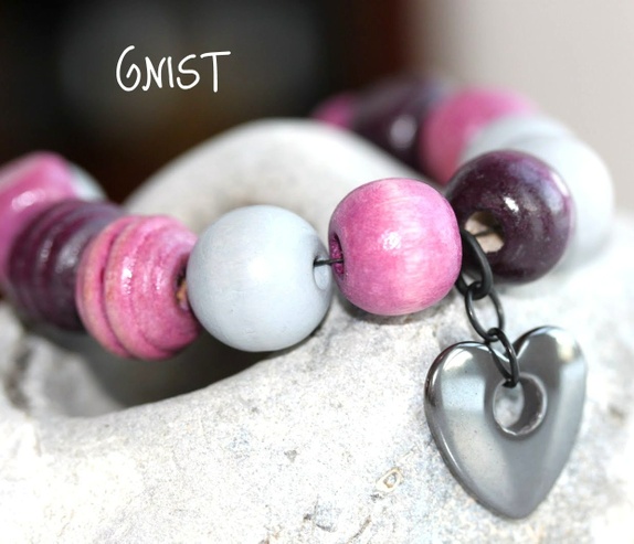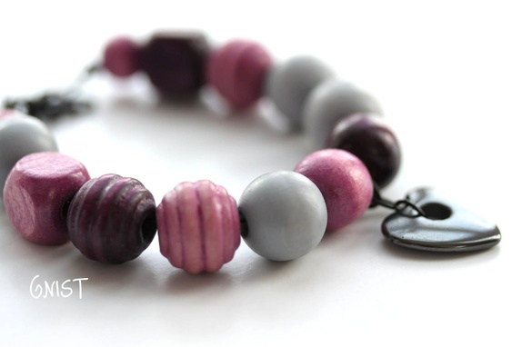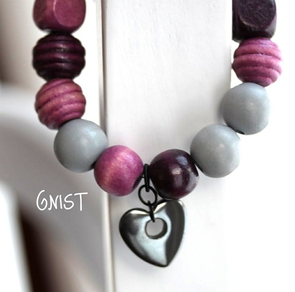 Armbånd i ulike lilla nyanser og grått. Svart hjerte charms og svart regulerbar lås.Armbåndet er laget av store treperler og er veldig lett.