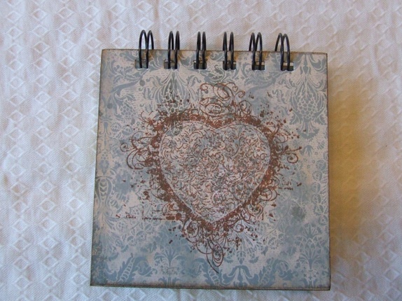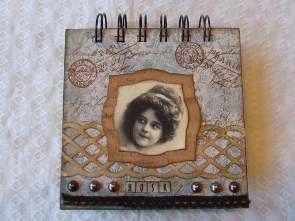 Post-it bok pyntet med vintagejente, blonde, halvperler, og stempel.Teksten HUSK under bildet.