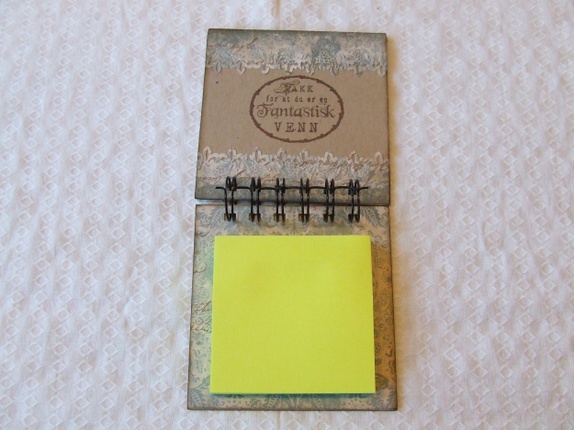 Inni er det gule lapper på ene siden og teksten" Takk for at du er en fantastisk venn" på den andrePå baksiden er det stemplet et hjerte