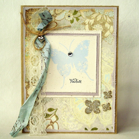 Det er dekorert med designpapir og et håndstemplet motiv av en lys blå sommerfugl med bling. Bånd, blonder, et lite sølvhjerte og blomster av sølv glassglitter pynter opp. Ordet "Verdsatt" er håndstemplet i sort.