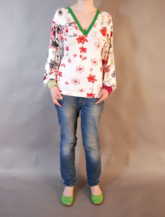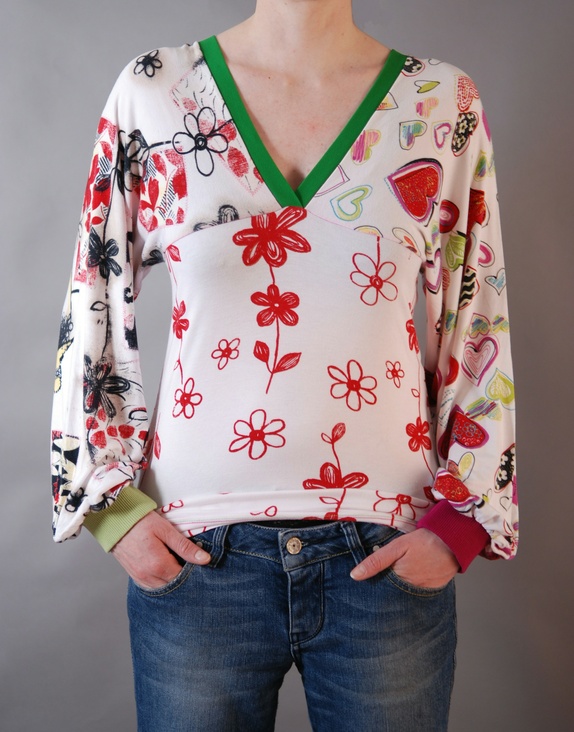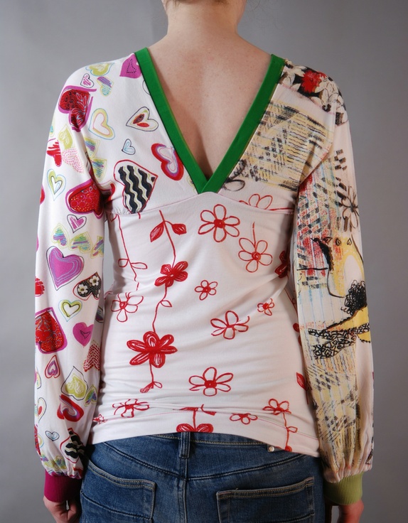 Beskrivelse: Stilig genser med V-hals og ulike stoffmønstre på genser delene. Genseren har grønne kanter i V-hals sone. Kantene av ermene er ulike. På den ene er det lysegrønt, på den andre er det rosa. Man kan bruke genser både foran og bak.
