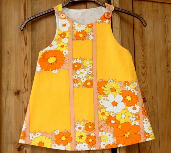 Tøff Majakjole i knallgult med blomster i oeansje og hvitt - redesignet fra et 70-talls-dynetrekk.