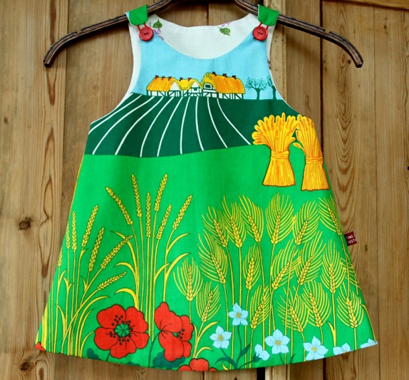 Frisk, fargerik og sommerlig Majakjole med stortmotiv av en sensommerdag på landet.
