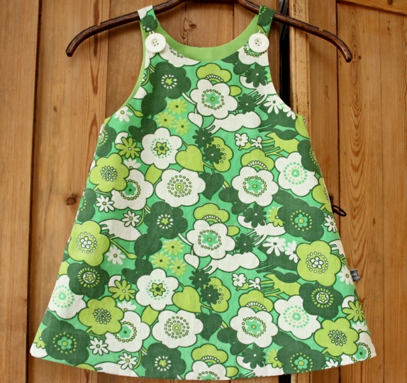 Fór i ensfarget grønt bomullsstoff og store, hvite knapper som festes med strikkhempe over skulderen.