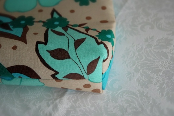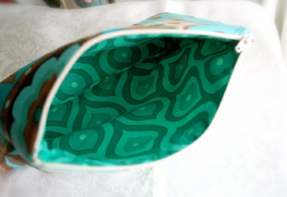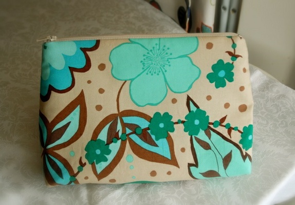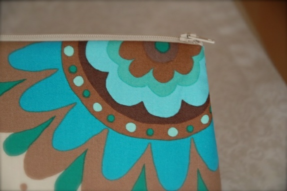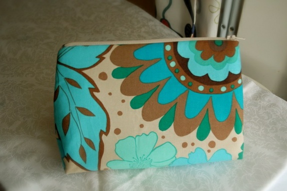 - En middels stor pung laget i bomull med mønster i petrol, blå og turkis. Retroinspirert mønster.