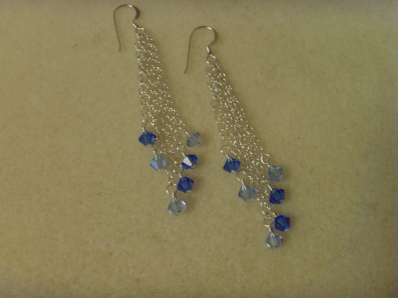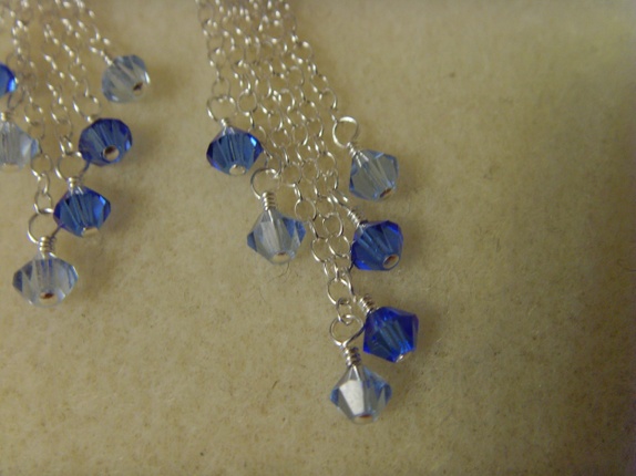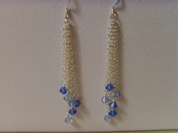 Øredobbene består av 4 mm bikone swarovski krystaller i fargene Sapphire og Light Sapphire, som henger fra 925s sølvkjede. All metall er 925s sterling sølv.