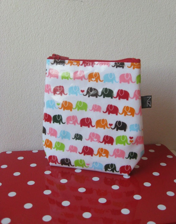 Liten pung sydd i et hvitt kraftig plastbelagt bomullsmateriale med marsjerende elefanter i rødt, rosa, grønt, blått og brunt. Pungen har glidelåsåpning på 10 cm.