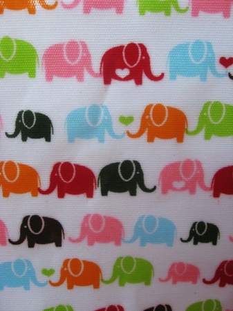 Liten pung sydd i et hvitt kraftig plastbelagt bomullsmateriale med marsjerende elefanter i rødt, rosa, grønt, blått og brunt. Pungen har glidelåsåpning på 15 cm.