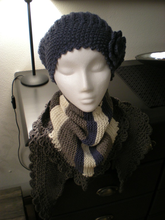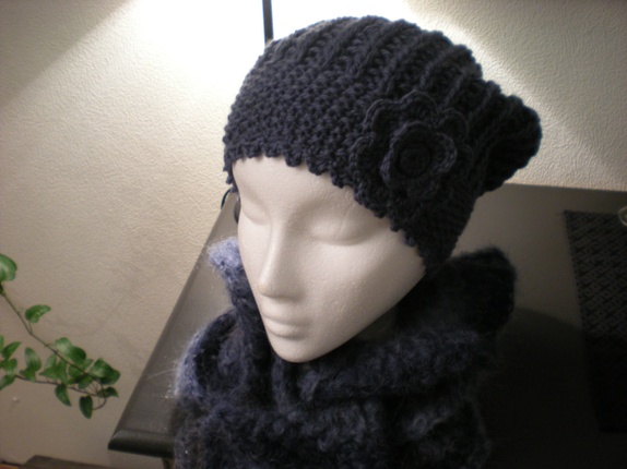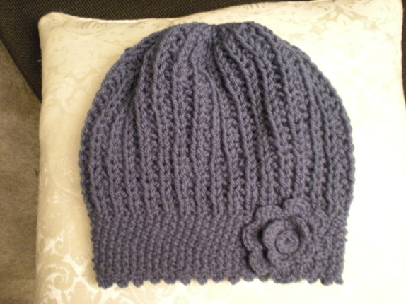 Strikket i deilig og mykt Nepalgarn fra Drops Design. 65% ull og 35% alpaca. Håndvask. Følg vaskeanvisning nøye. Vrangbord er strikket i perlestrikk med heklet picotkant og resten av luen i halvpatent. Blomst er laget som er brosje med nål bak. Baggy modell. One size.