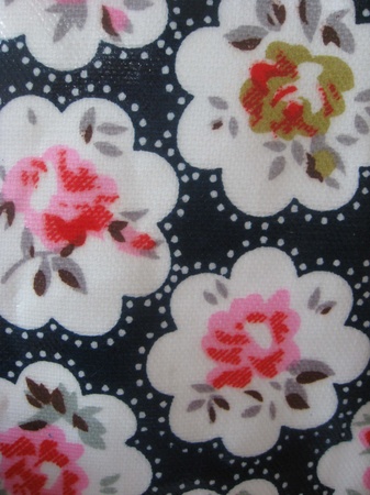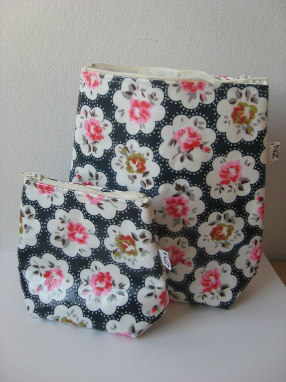 Liten pung sydd i et blåsort, kraftig plastbelagt bomullsmateriale med romantiske rosa roser på off-white "blomsterpartier". Pungen har glidelåsåpning på 15 cm.
