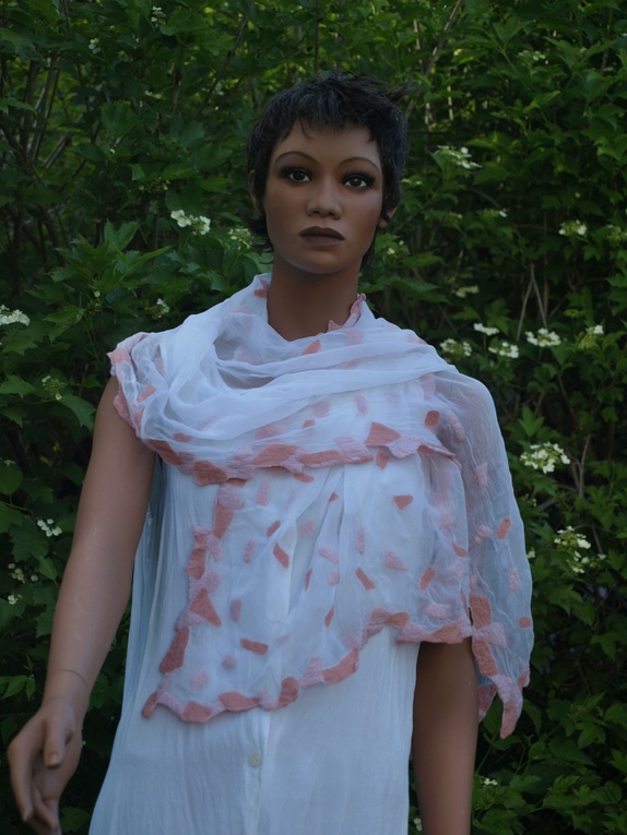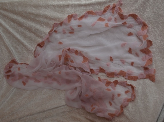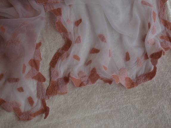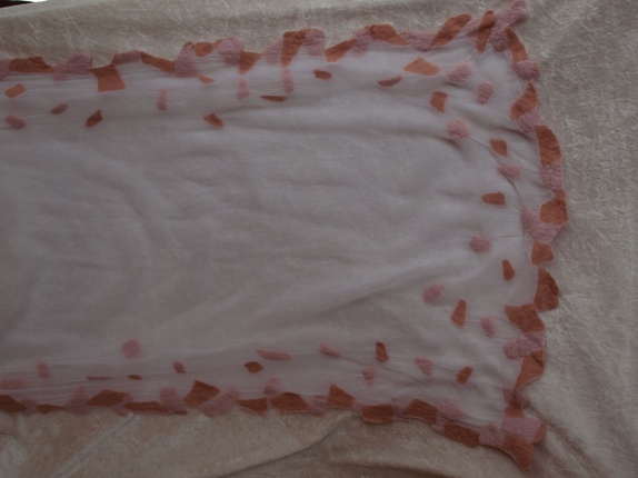 Florlett skjerf/sjal, hvit viscosechiffon med rosa dekor i merinoull.