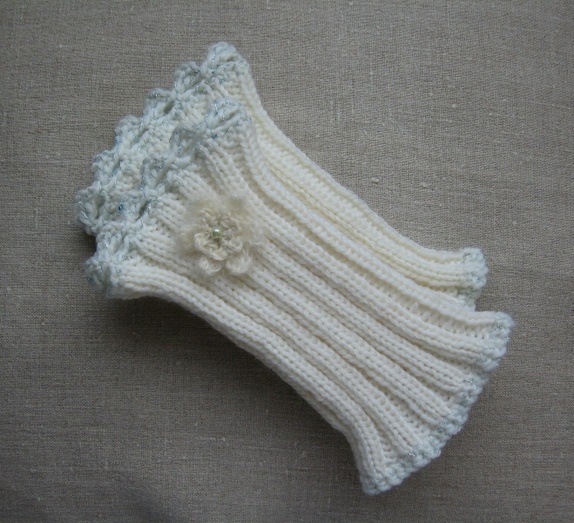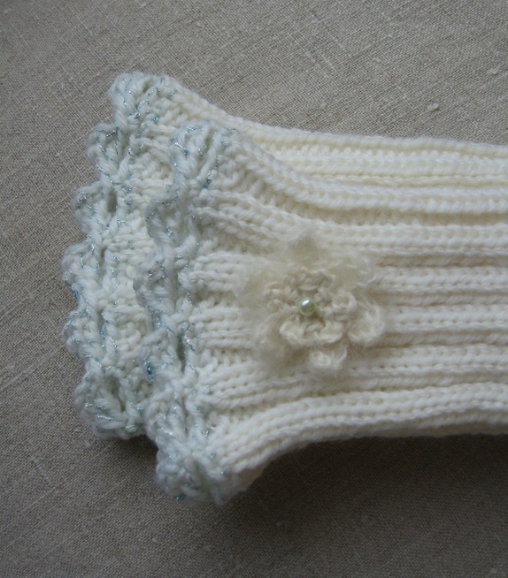 Hvite pulsvarmere strikket i et middels tykt ullgarn. Dekorasjonstråd i sølv/turkis heklet inn i kantene.