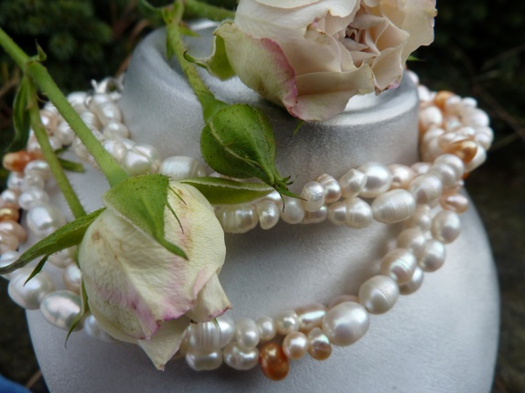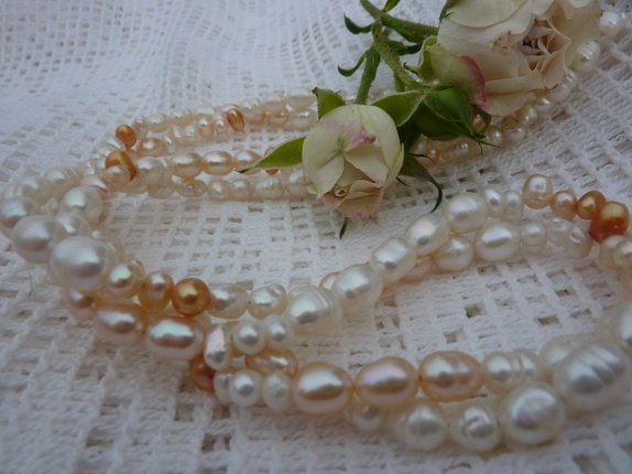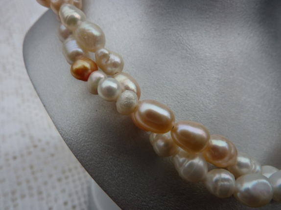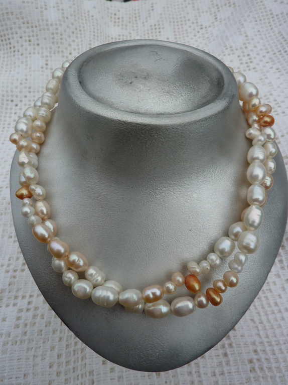 Har nå laget et pent tvinnet dobbelt halssmukke.Ferskvannsperlene er av forskjellige størrelse og farger.Nydelig glans. Karabinlås.Smykke er 54 cm langt så det passer til de fleste.