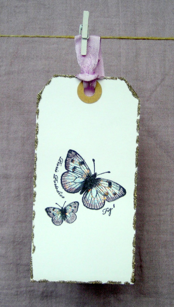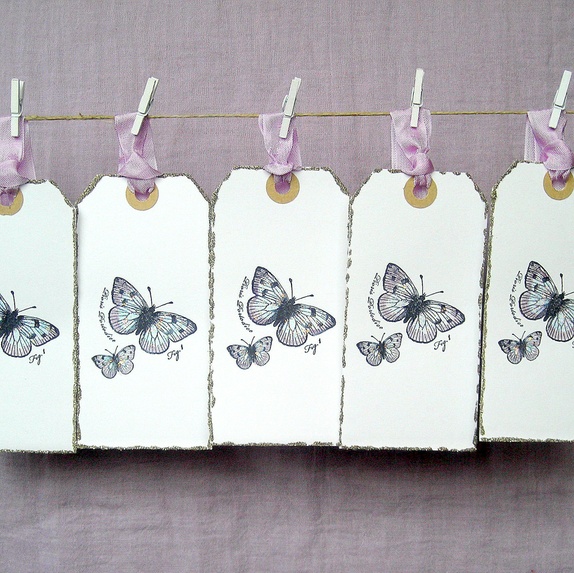 De er pyntet med håndstemplede sommerfugler med lilla shimmermaling og sølv glassglitter i kantene. På baksiden er det stemplet "Til" og "Fra", og det er plass til å skrive en evt personlig hilsen. Fiolette sløyfebånd hører med.