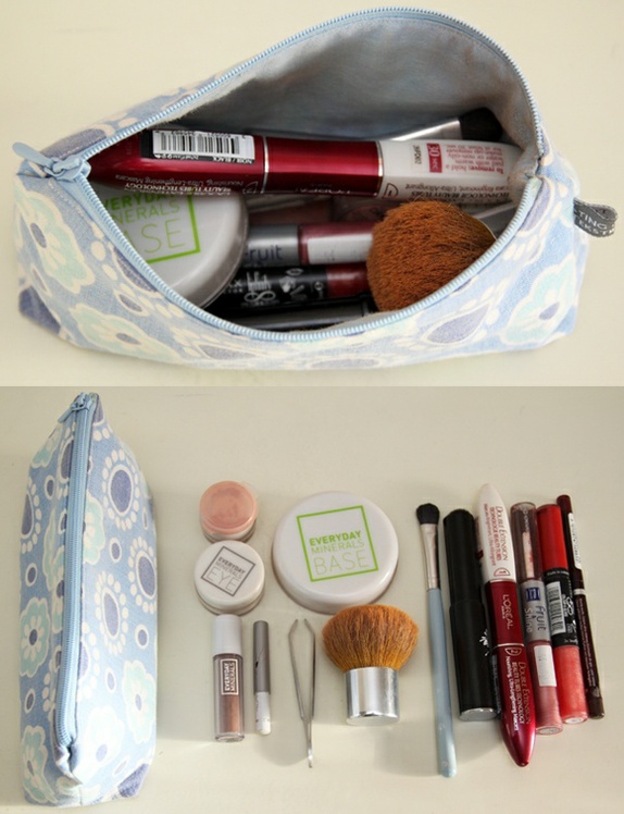 Miljøvennlig sminkepung, sydd av gjenbrukte stoffer i 100% bomull.