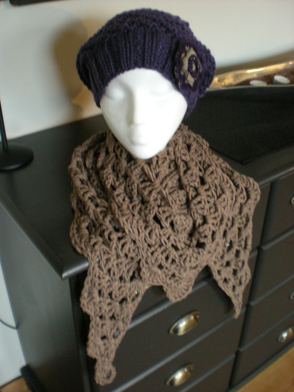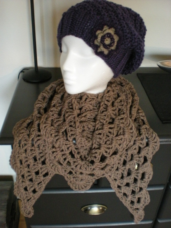 Heklet i supersoft Coragarn fra Drops Design. 60% merino ull og 40% polyacryl. Godt og varmt, men som ikke klør. Maskinvask. Ikke bruk skyllemiddel. Brosje er laget i sort litt blankt garn med pålimet perler i sort og gyldne farger og har påsydd brosjenål bak. Brosjen kan brukes til å dandere sjal/skjerfet på mange måter :).