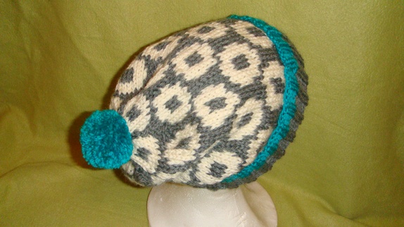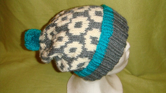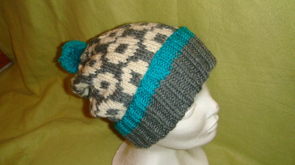 Luen er i Mellom grå,eggehvit og turkis.Den er strikket i 100% ren ny ull. Størrelse Dame/ ungdom. Kan vaskes på ullprogram 30 grader.