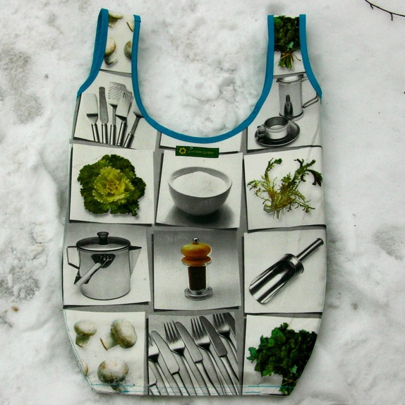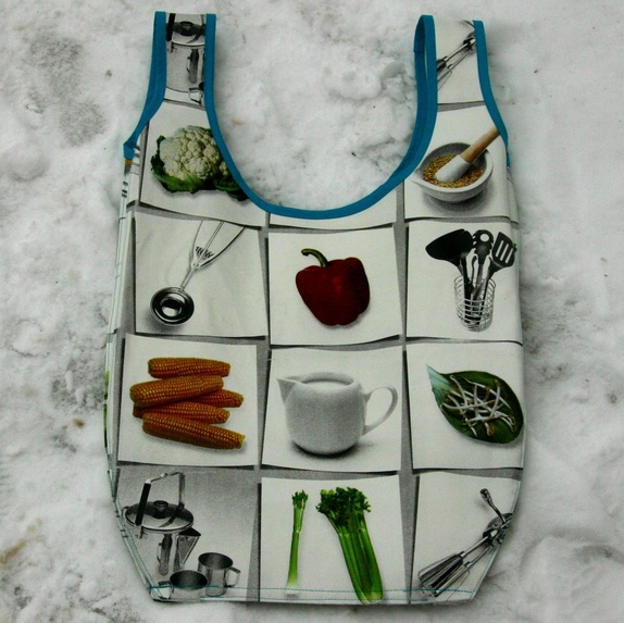 Denne er sydd av voksduk med bilder av masse matvarer som er funnet på loppemarked. Turkis skråbånd langs hankene.