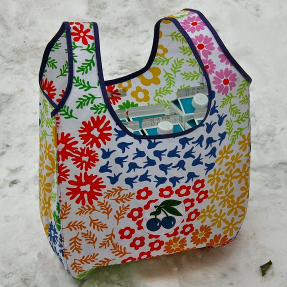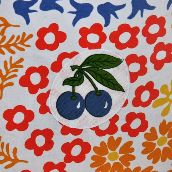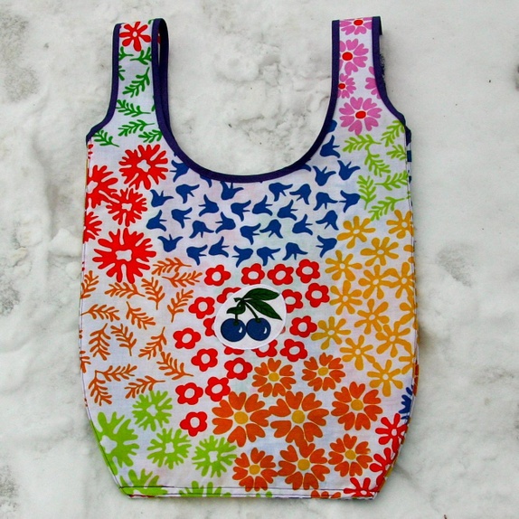 Denne er sydd av voksbelagt bomull med masse fargerike blomster som er funnet på loppemarked. Liten dekorasjon med blå kirsebær fra en duk som også kommer fra loppis. Kantet med lilla skråbånd.