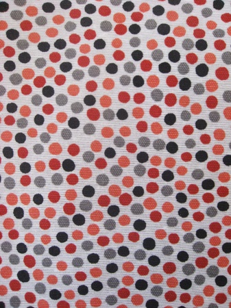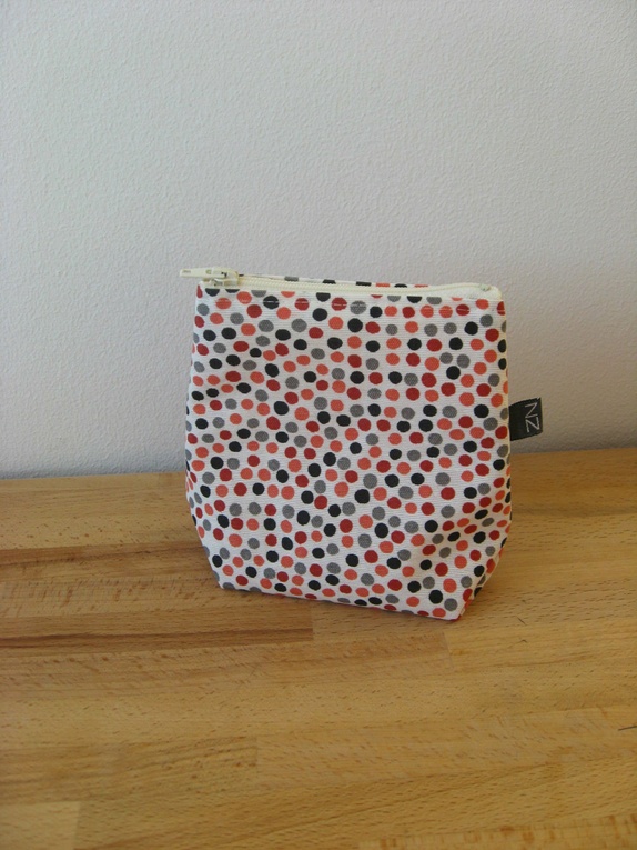 Pungen er sydd i en offwhite/beige kraftig bomullsblanding med prikker i oransje, rustrødt, sort og grått. Pungen har en glidelåsåpning på 10 cm.