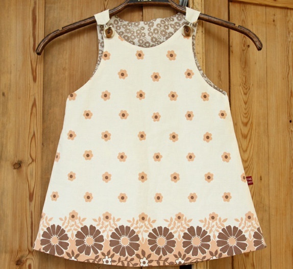 Søt Majakjole lys beige bomullsstoff med retroblomster i brunt. Strikkhemper på skulderstroppene som festes over brune vintage knapper.