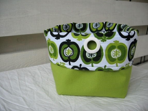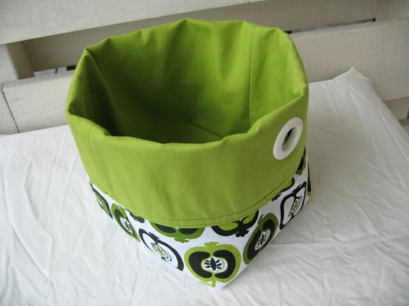 Romslig stoffkurv i bomull - grønne epler på hvit bunn.