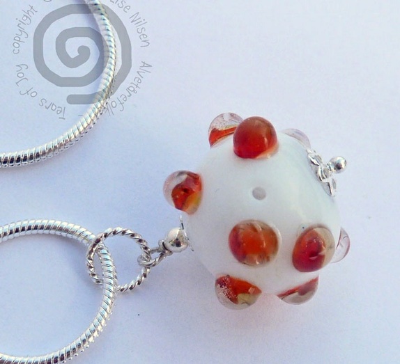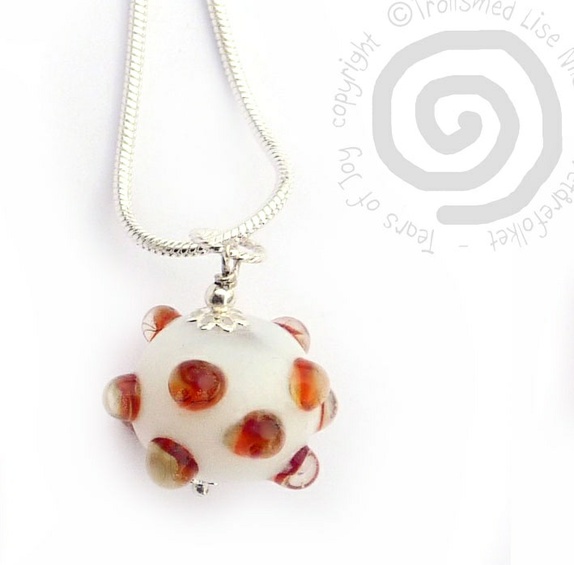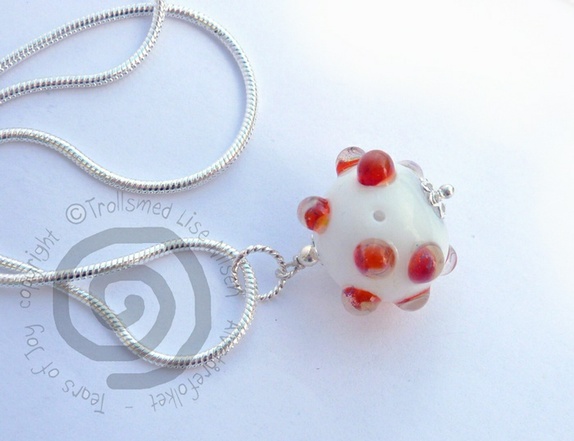 Smykke i håndlaget glass. Denne planeten har et mystisk hull og noen har antakelig flyttet inn. Så den må gå på tilbud. Regnbueplaneten er her i verden som en herlig glassperle med regnbuefarger.