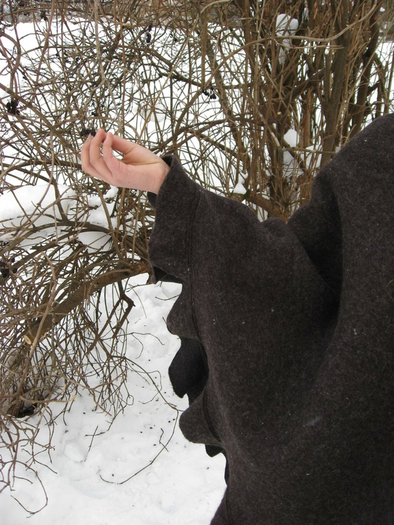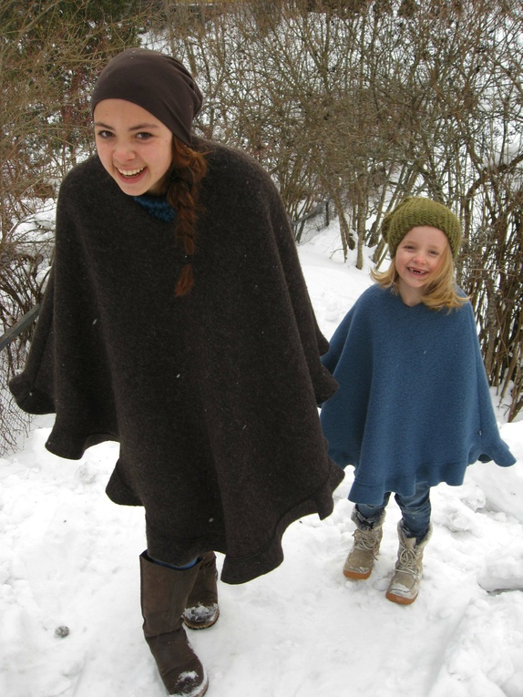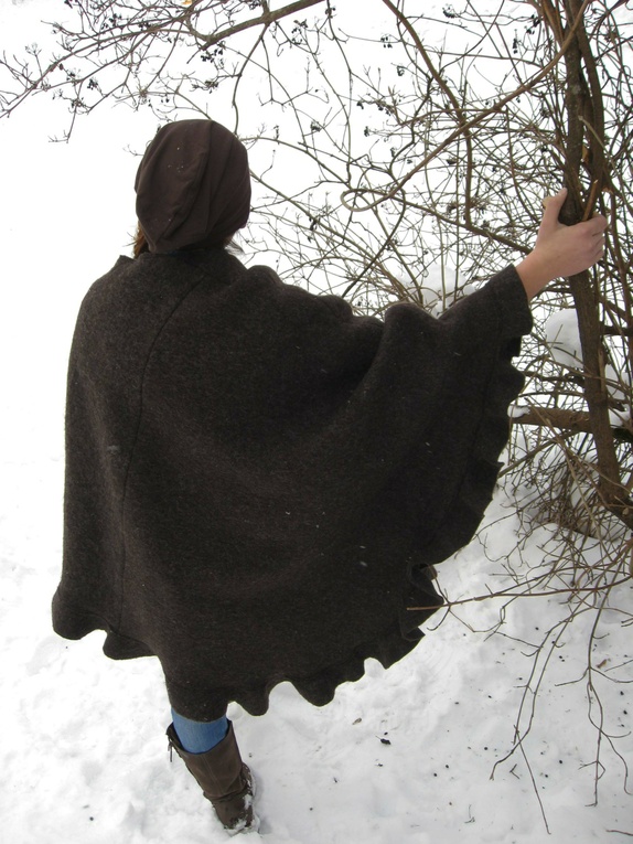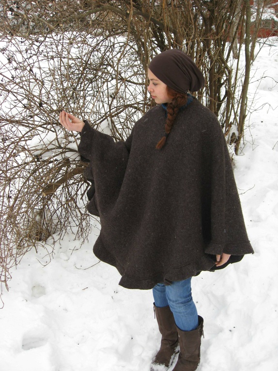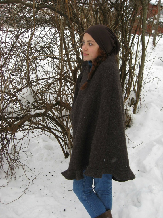 Varm og deilig ullponcho i en nydelig brun farge. Ponchoen er sydd opp i et strikket og tovet ullmateriale med noe stretch. Den er formsydd over skulderpartiet og stoffet er klipt på skrå, noe som gir plagget et fint fall. Halsringningen er V-formet og ponchoens nederkant er avsluttet med en søt volang med bredde på ca 6cm. Ponchoens lengde er 96cm fra skulder til nederkanten midt foran.