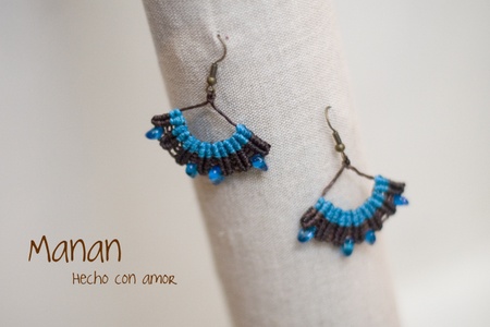Disse øredobbene har jeg knytt med over 300 knuter i vokset polyestertråd. Endene av trådene har jeg smeltet inn i knyteverket.
