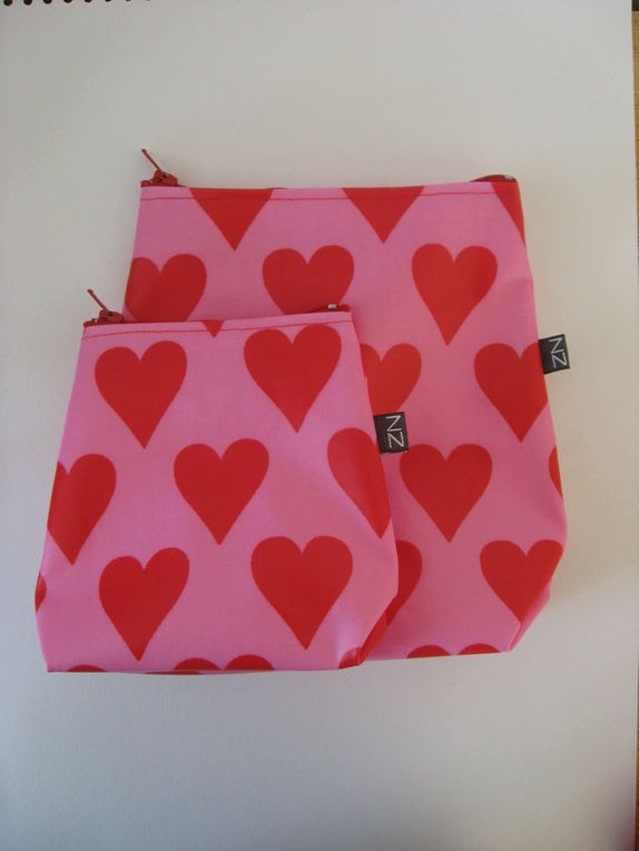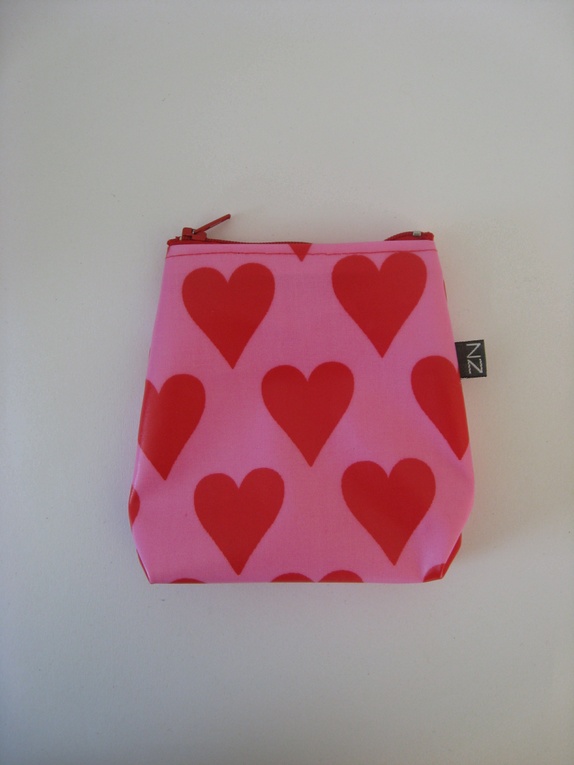 Liten rosa pung med 10 cm glidelåsåpning og røde hjerter som har plass til litt sminke, smykker og andre hemligheter?