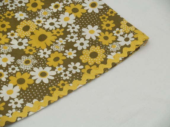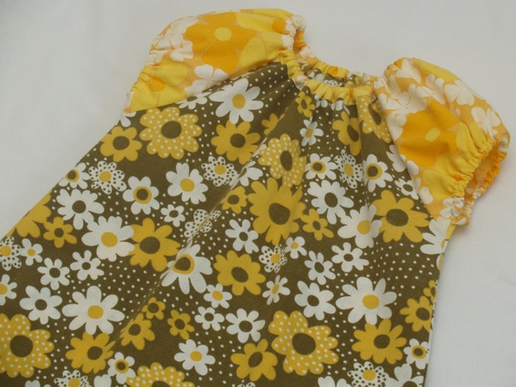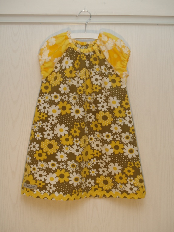 Blomstrende rynkekjole i gyldne farger, sydd av dynetrekk. Ren bomull. Strikk i hals og armer. Pyntet med en bred, gul kroklisse nederst på kjolekanten.