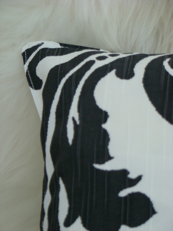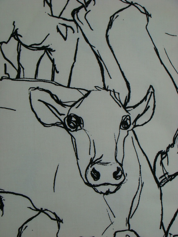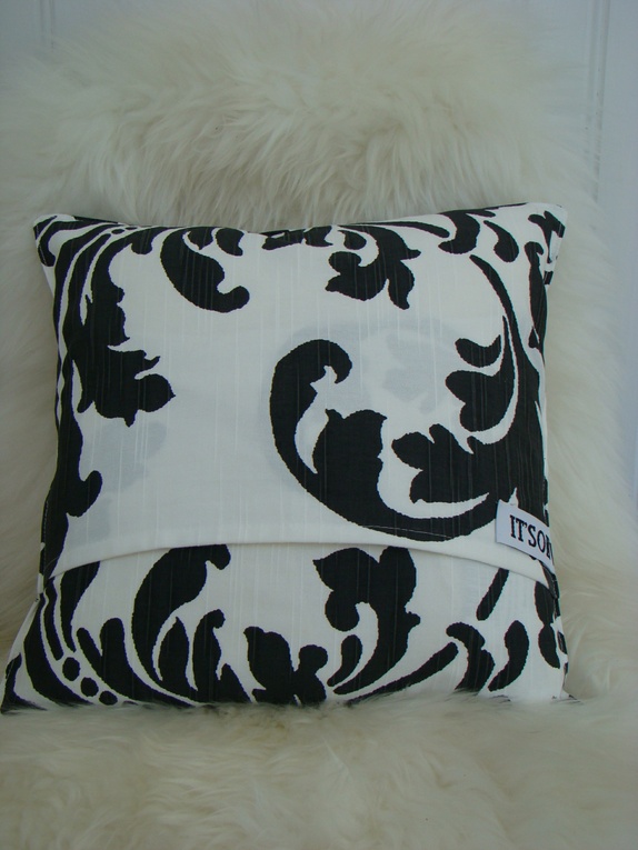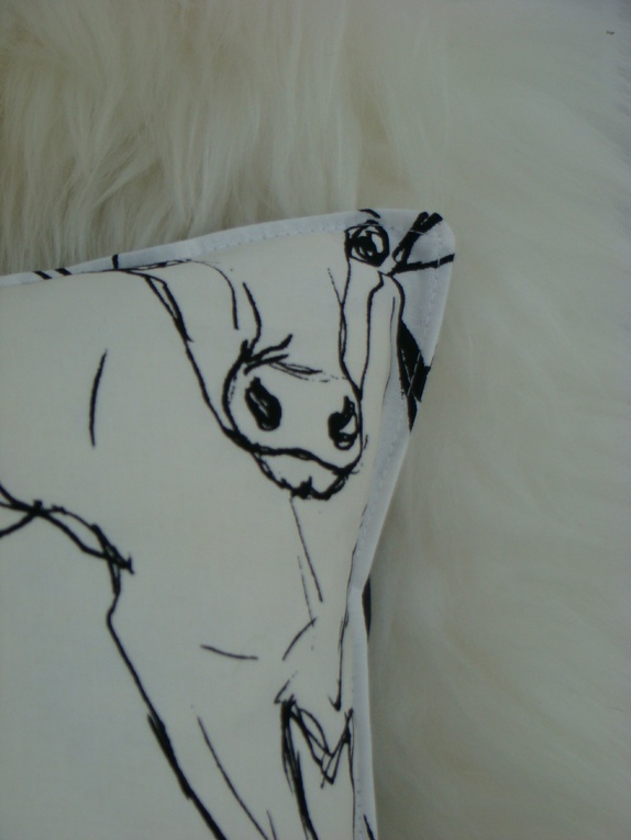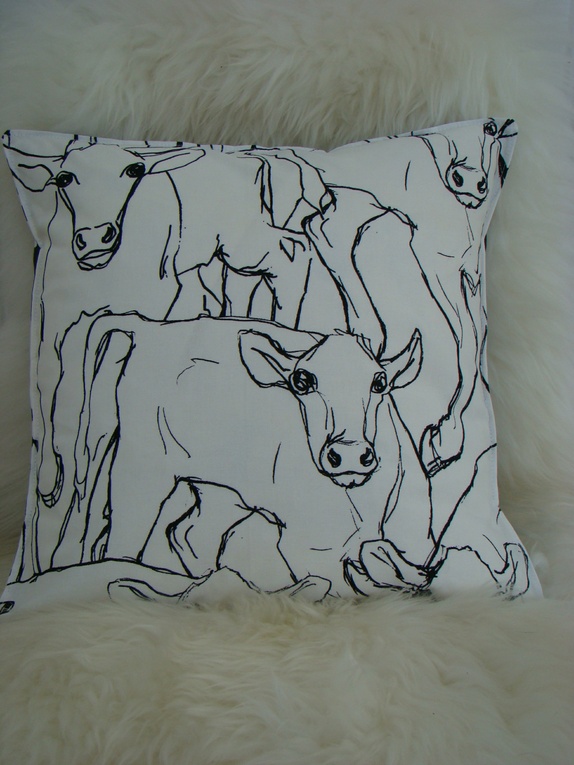 Putetrekk sydd av stoff fra Marimekko. Hvit bomull med svart ku-print. Bakside i svart- og hvitmønstret bomullsstoff. Konvoluttåpning. Alle sømmer er overlocket. Stikningssøm i siden som gjør at puten enkelt holder fasongen også etter vask. Stoffene kan vaskes på 60 grader, men ettersom putetrekket er håndlaget anbefales vask på lavere temperatur normalt med mindre det tilkommer flekker som krever høy temperatur.