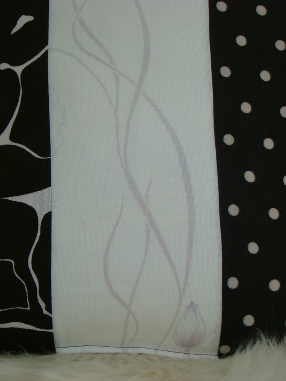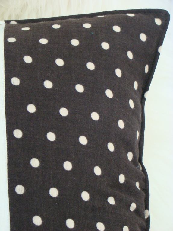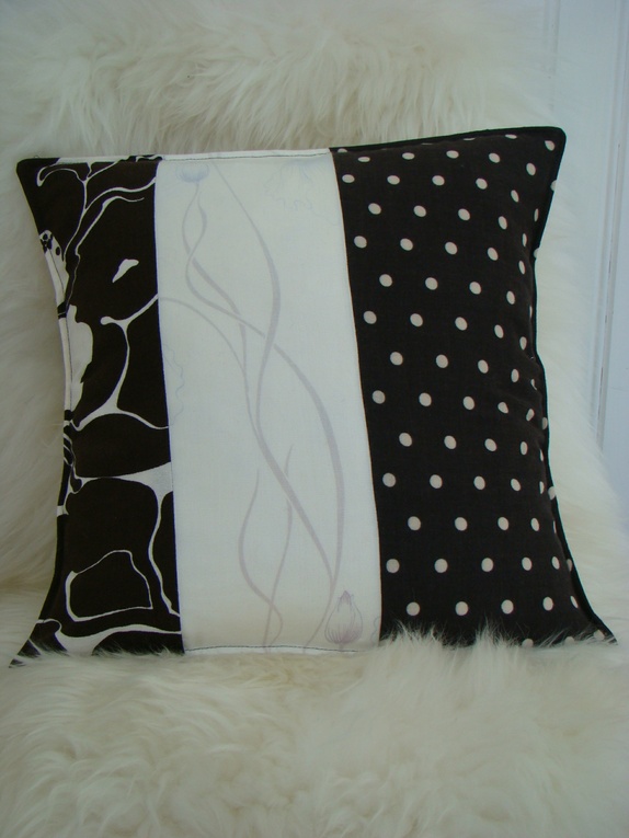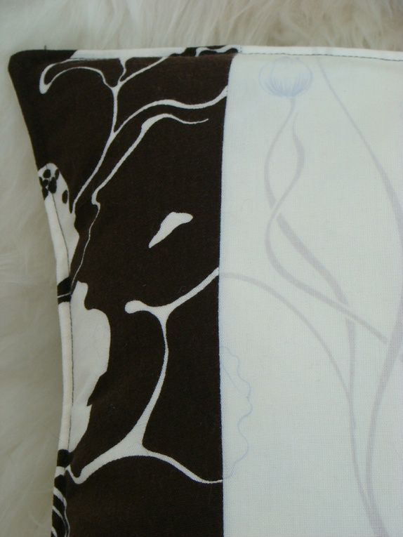 Putetrekk sydd av en blanding av vintage og nye stoffer i brun og kremfarger. Bakside i matchende stoff som i midten av framsiden. Konvoluttåpning. Alle sømmer er overlocket. Stikiningssøm i sidene - slik holder puten enklere fasongen også etter vask.