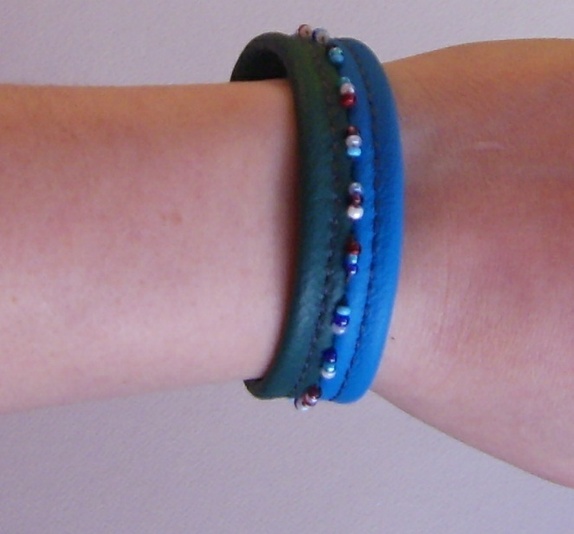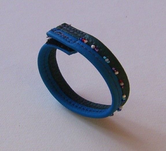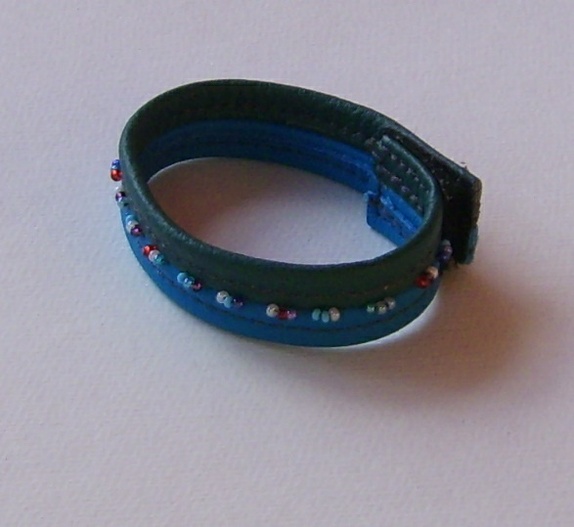 Ca 21cm indre lengde og 2cm bredt av ekte skinn. Sydd på maskin med vokset tråd, glassperlene er sydd på for hånd. Lukkes med borrelås. Mykt og behagelig å ha på, ingen deler som kan irritere huden.