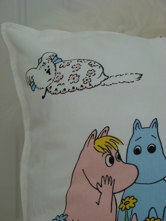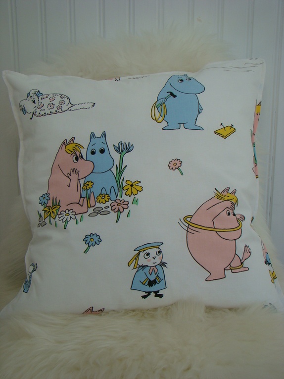 Pute sydd av bomullsstoff med herlige prints. Stoffet er kjøpt på marked i Mummifamiliens hjemland, Finland. Bakside i hvitt og lyseblått bomullsstoff med konvoluttåpning. Alle sømmer er overlocket. Stikningssøm i sidene. Passer innerpute 50 x 50 cm, men denne følger ikke med.