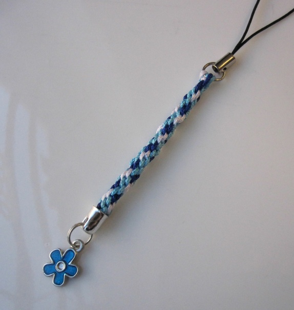 Mobilpynt i flettet nylonsnor med sølvfargede metalldetaljer og svart hempe. Blomst i sølvfarget metall/ blå emalje.