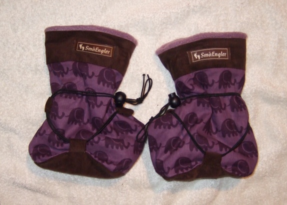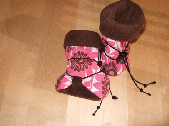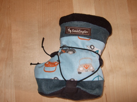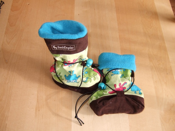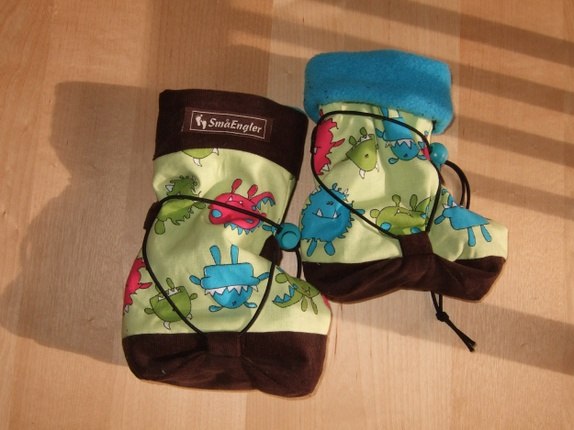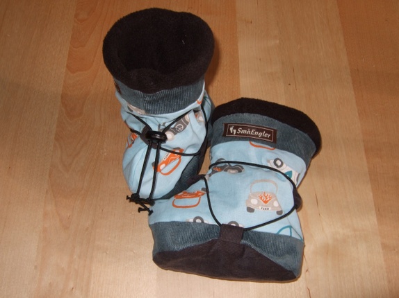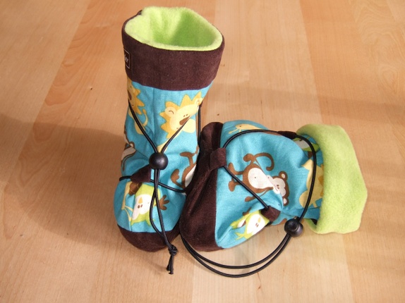 Veldig praktiske til bruk i bæremeis, vogn, bilstol osv. Varmer godt på små bein. Disse er sydd i bomull og babycord som ytterstoff, og foret med deilig fleece. Jeg syr også babyboots med vannavstøtende og vindtett stoff mellom bomullen og fleecen inni, eventuelt ull på utsiden og fleece eller teddyfor inni.