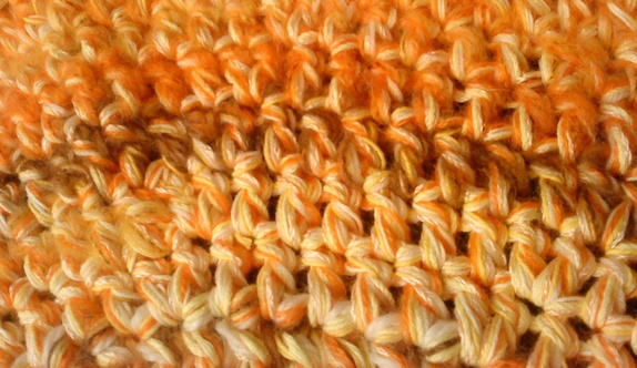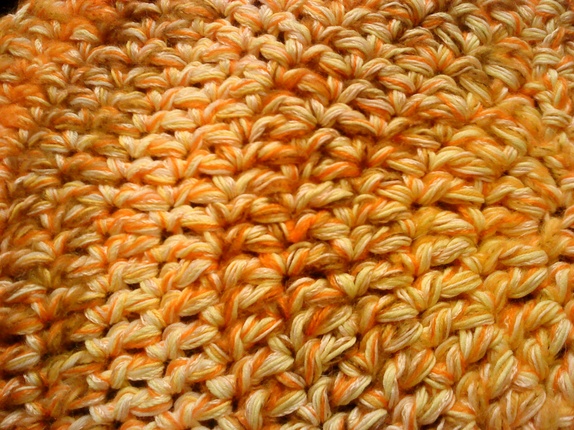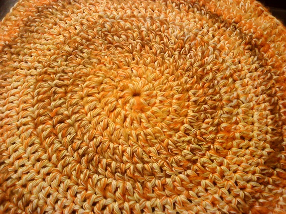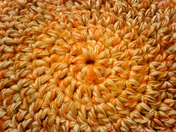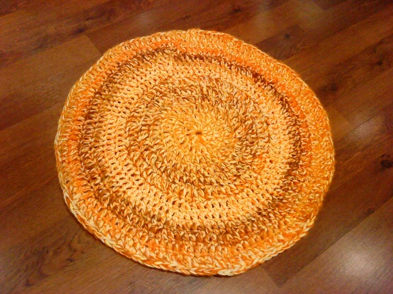 Gulvmatte / gulvteppe, heklet av flere typer garn og farger, mest gultoner/oransje og brunt.