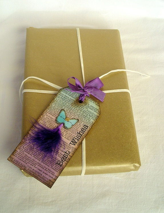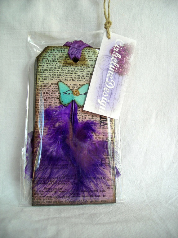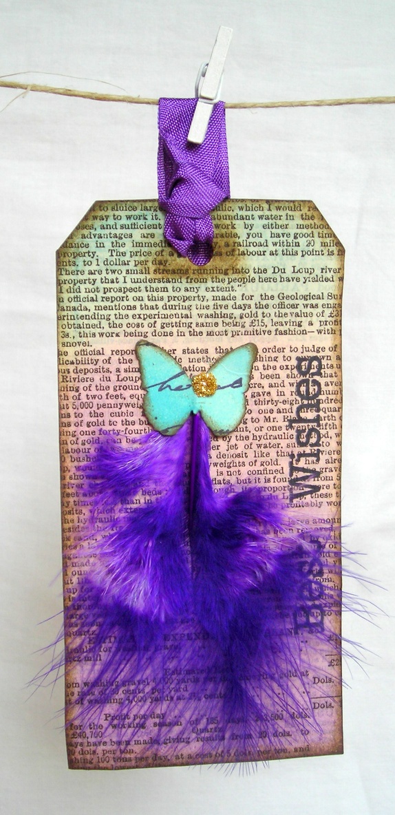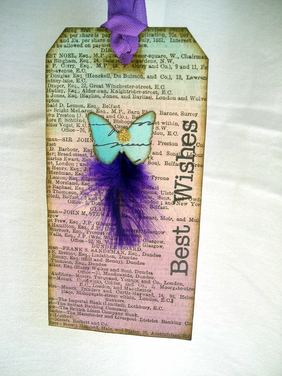 Motivet er en turkis sommerfugl med gullglitter og lilla fjær på en lilla/turkis bakgrunn. "Best Wishes" er stemplet i sort. På baksiden av lappene er det stemplet "Til" og "Fra", og det er god plass til å skrive en personlig hilsen.