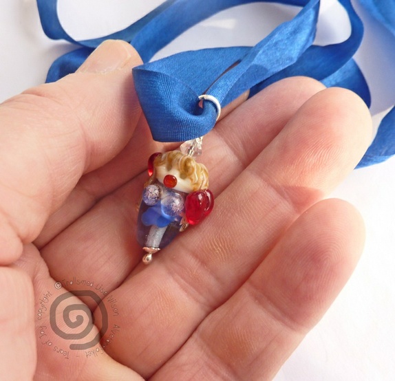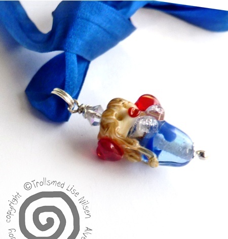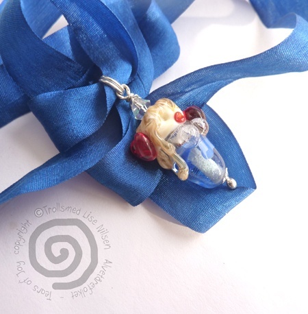 Denne er liten og blå og god og rund. Hun er ca 2,8 cm høy og henger i en ekte silkesnor som du kan knyte så lang du vil.