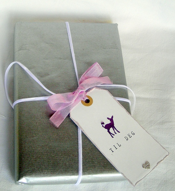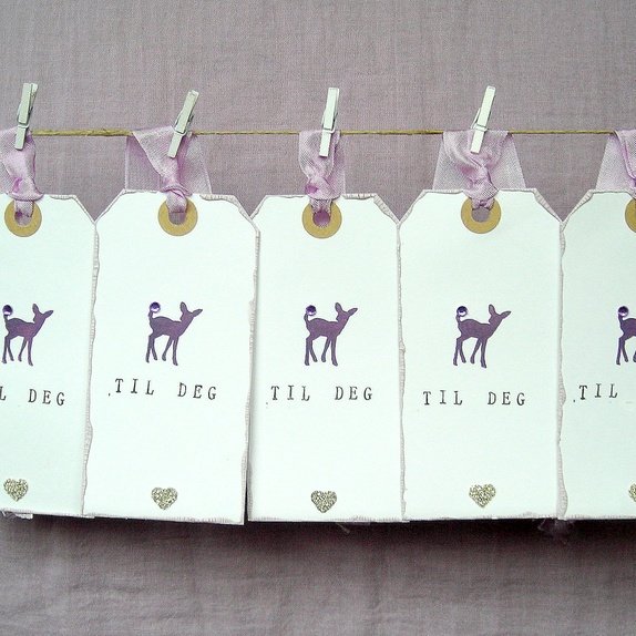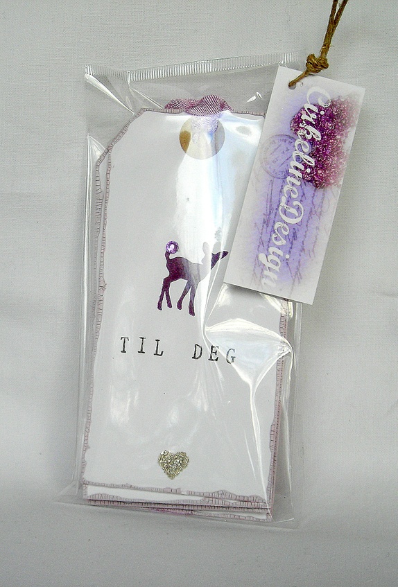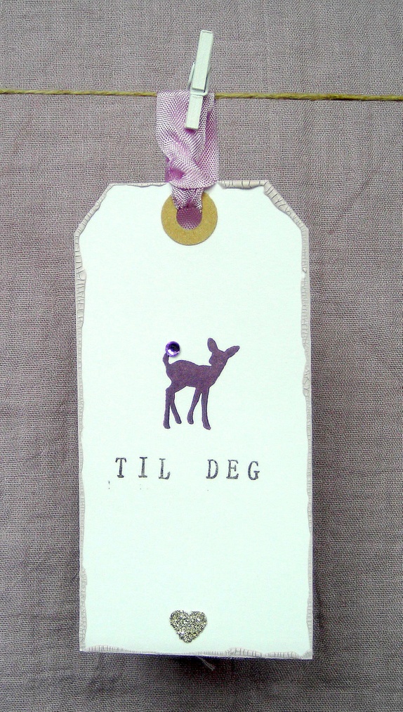 Et lite rådyr er håndstemplet i mørk lilla og har en liten "edelsten" på halen. Kantene er malt med grålilla krakeleringsmaling, og et lite hjerte med sølv glassglitter pynter opp. "Til deg" er stemplet i sort". På baksiden er det stemplet "Til" og "Fra", og det er plass til å skrive en personlig hilsen. Lys fiolette sløyfebånd hører med.