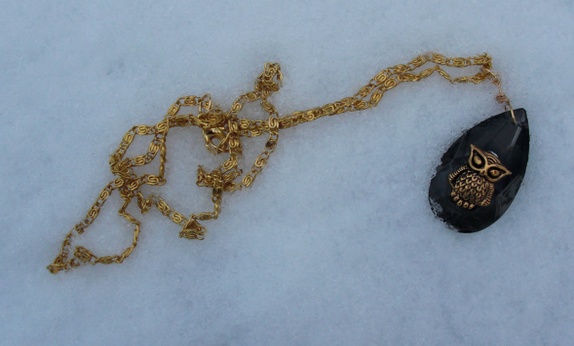 Nydelig liten ugle hengende på fasettert glassdråpe, som måler ca 38x22 mm.