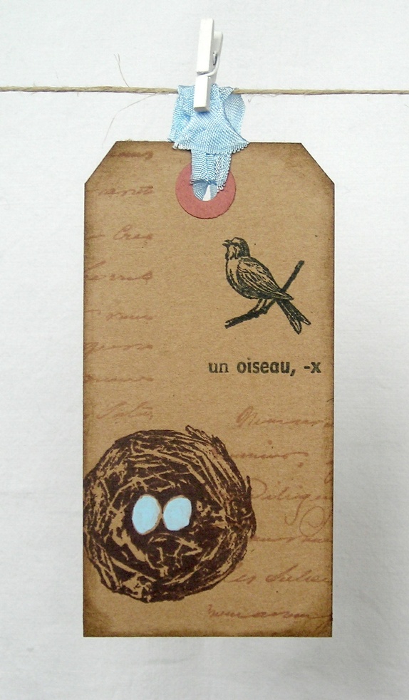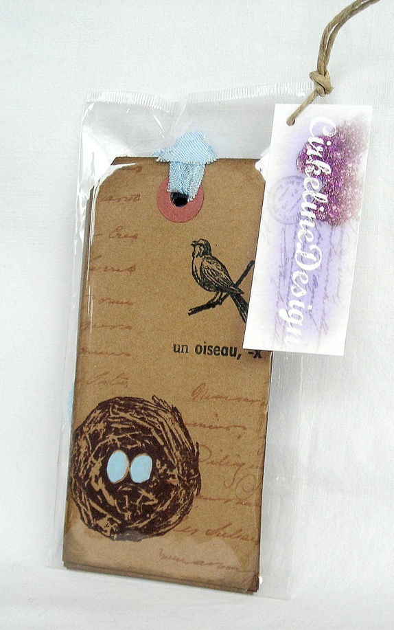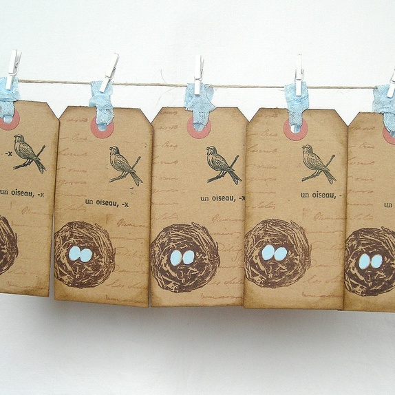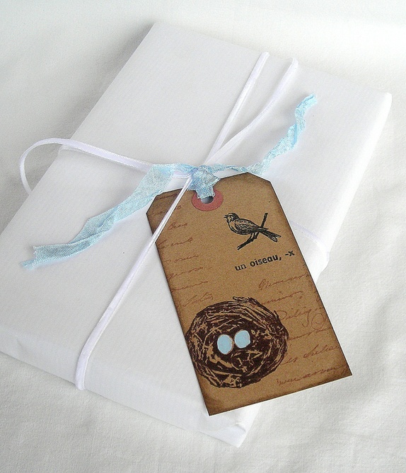 De er dekorert med håndstemplede motiver av en fugl, ordet un oiseau (fugl på fransk) og et rede med egg, som er malt lys blå. Kantene er svertet for "en vintage look". På baksiden er det stemplet "Til" og "Fra". Krøllete lys blå sløyfebånd hører med.