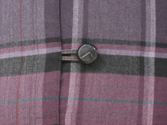 Knappelukning foran, med skinnreimer og 3 vintage knapper. Bakstykket er et koksgrått ullstoff.