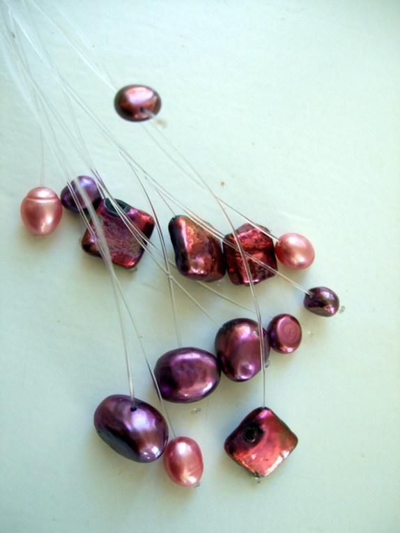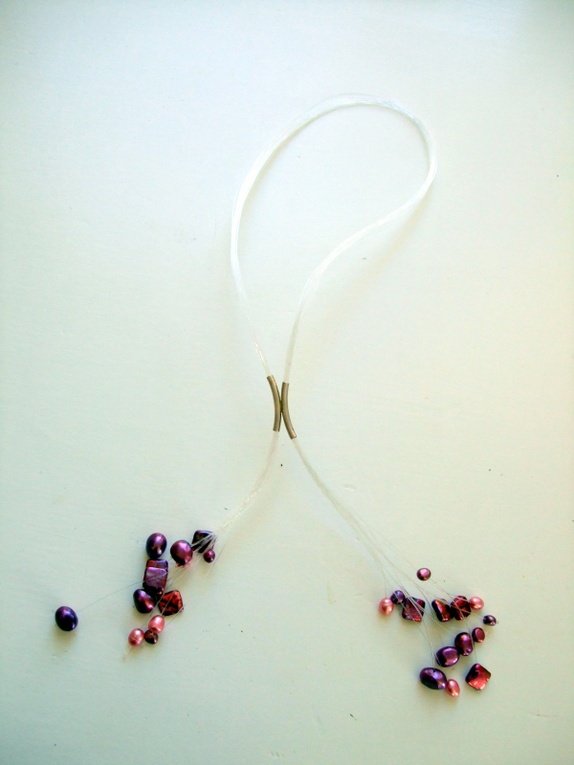 Halssmykke laget av fisketråd satt sammen med to rør i sølv. Nydelige farger i rosa og lilla toner: ferskvannsperler .