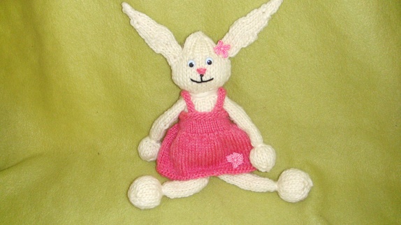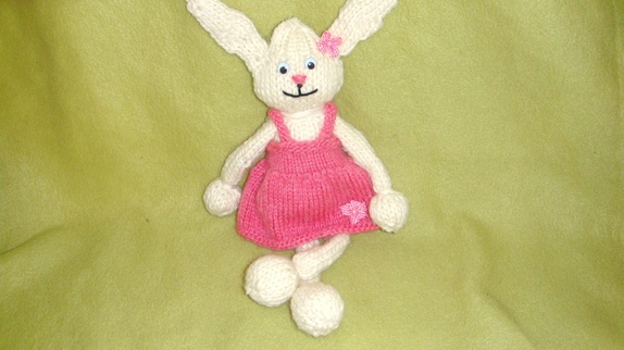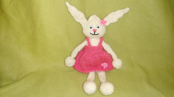 Kaninen er 40 cm lang.Den er strikket i 50% ull og 50% akryl. Hun har dingleben og armer(kun fyll i føtter og hender + kroppen) Øynene og.blomstene hun har til pynt er sydd fast.. Kan håndvaskes.