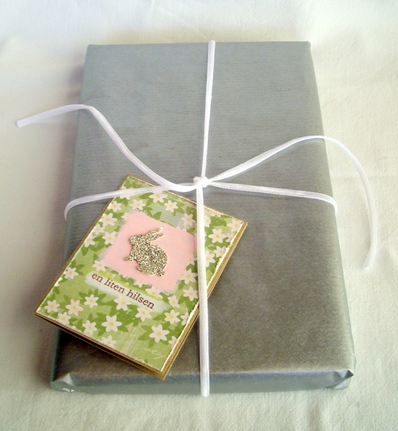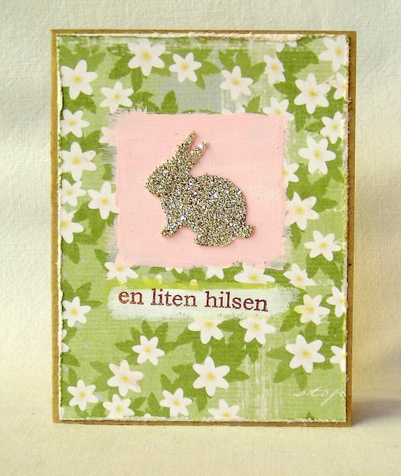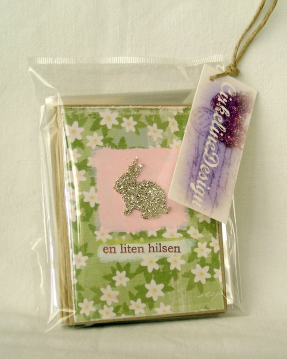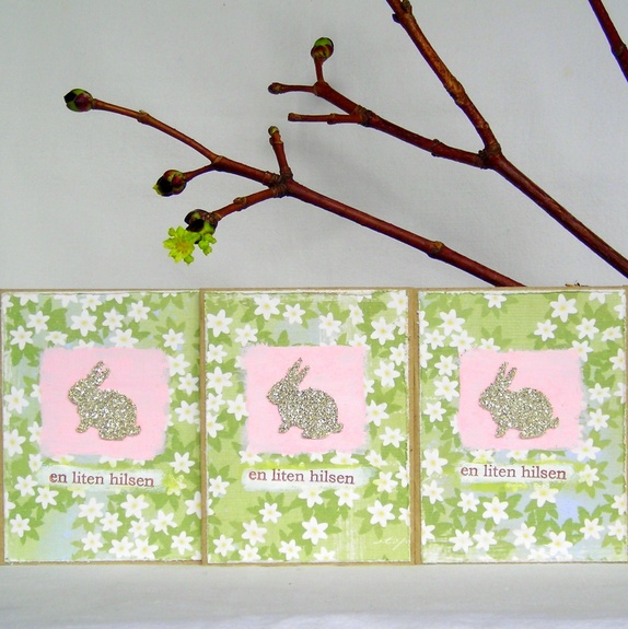 Kortene er pyntet med designpapir med hvitveismotiv, rosamaling og en kanin med sølv glassglitter. "En liten hilsen" er håndstemplet i sjokoladebrunt.