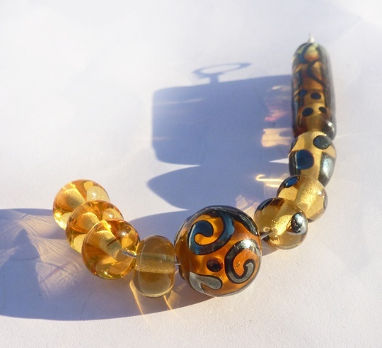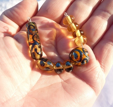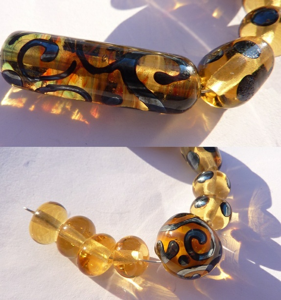 Håndlagde perler i sett med herlig gyllen glød og sølvsvart dekor.