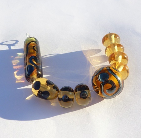 Sett - gyllent og sølvsvart, lampworkperler til smykkelaging